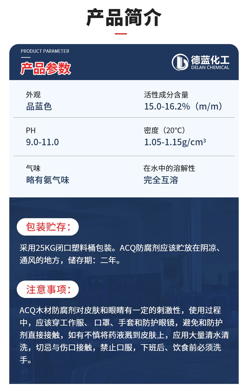 包装储存:25KG塑料桶或200KG塑料桶包装。 ACQ木材防腐剂存放于干燥通风的库房内,避免阳光直射。 储存期为十二个月。