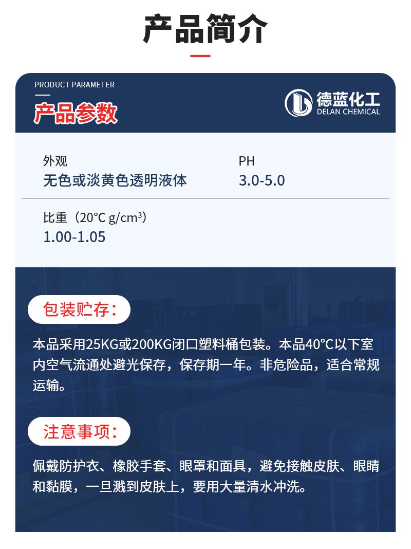 包装储存:采用25kg或200kg塑料桶包装,或按用户要求包装。应储存在阴凉避光处,保质期为一年。