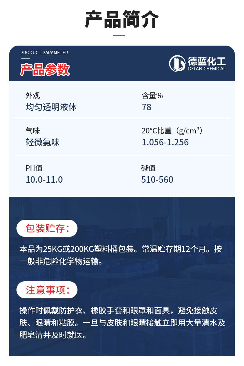 包装储存:采用25kg或200kg塑料桶包装,或按用户要求包装。应储存在阴凉避光处,保质期为一年。
