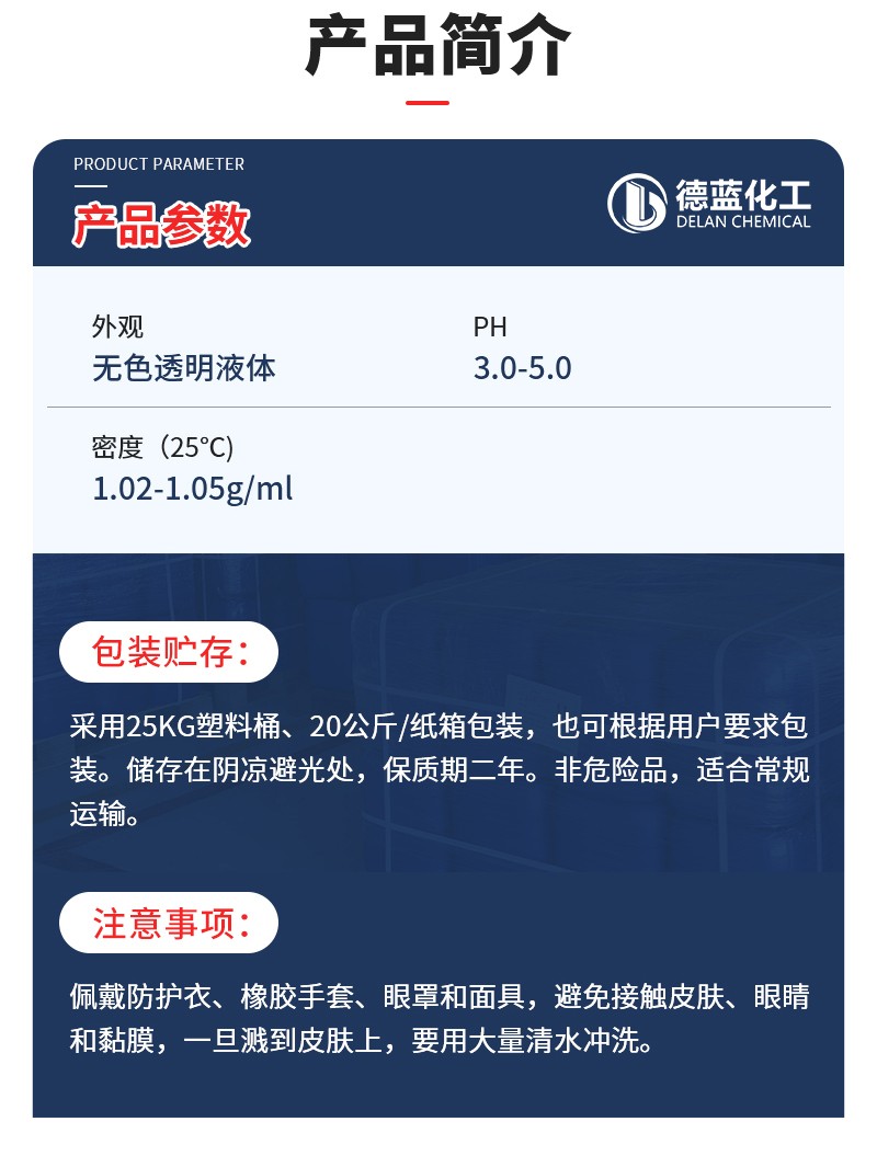 包装储存:清洗剂专用防腐剂DL-X105采用25kg塑料桶包装,也可根据用户要求包装。储存在阴凉避光处,保质期二年。 非危险品,适合常规运输。