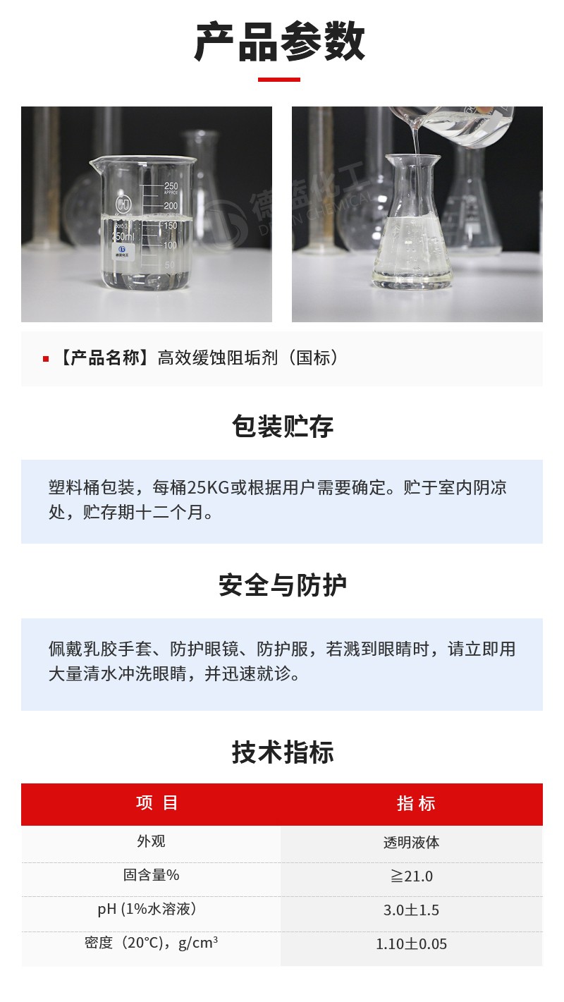 DL-500高效缓蚀阻垢剂为绿色水处理配方,同时具有生物可降解、无磷的特点,排放水不需经特殊处理即可达到国家环保污水排放一级标准(总磷≤0.5mg/L)。组分中的聚环氧琥珀酸除了具有生物降解性好的特点外,还具有用量小、阻垢性能优异等优点,在高碱度、高硬度水中阻垢率相当高,明显优于常用有的机膦酸ATMP和HEDP等阻垢剂,并且兼有阻垢、缓蚀双重功能 ......