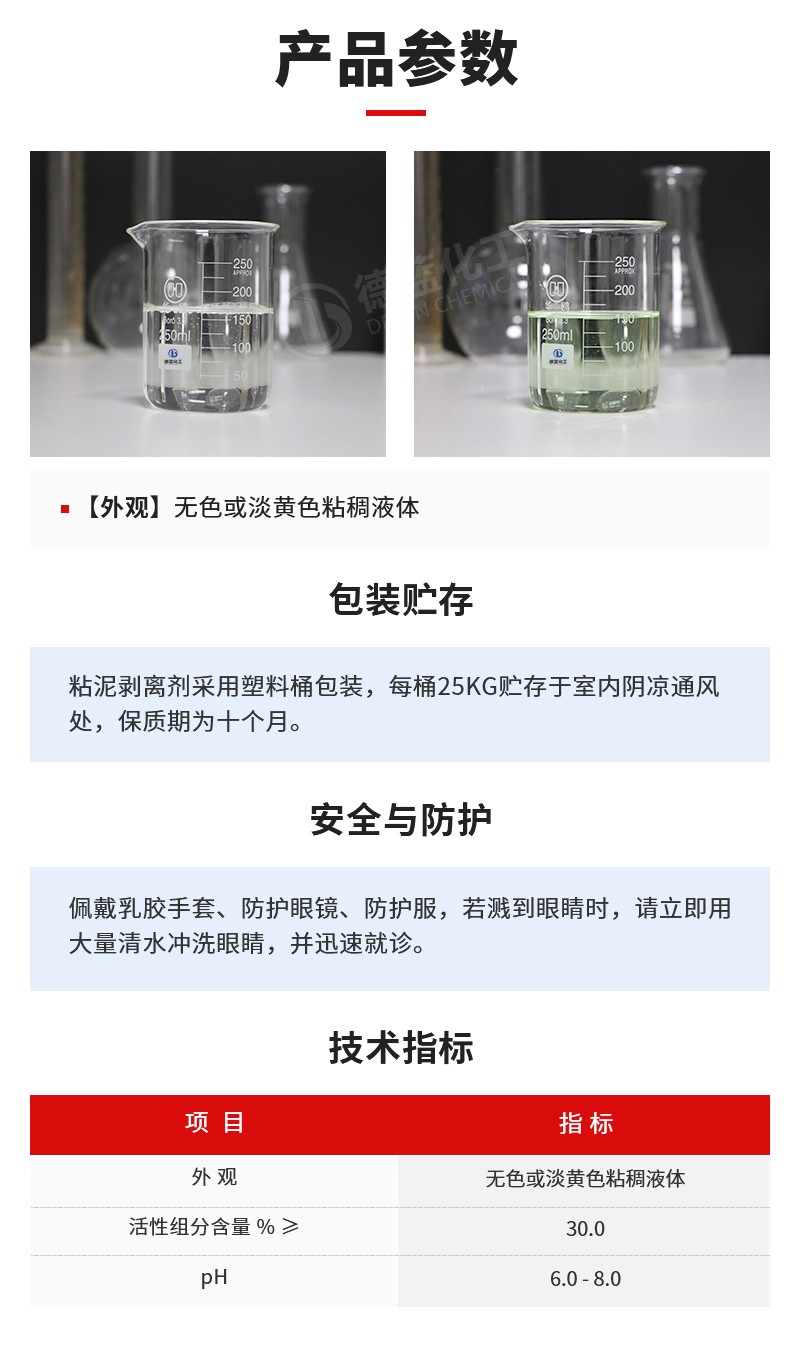 包装储存:粘泥剥离剂采用塑料桶包装,每桶25kg贮存于室内阴凉通风处,保质期为十个月。