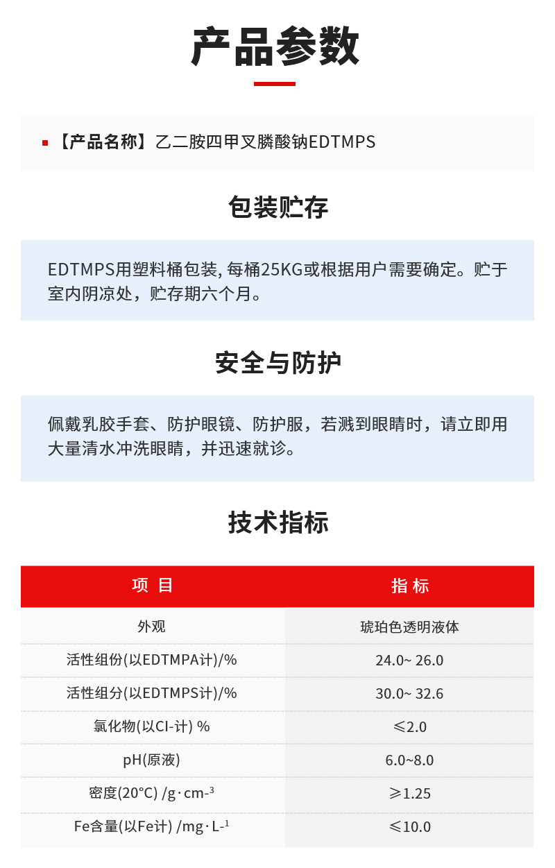 包装储存:EDTMPS用塑料桶包装, 每桶25kg或根据用户需要确定。贮于室内阴凉处,贮存期六个月。