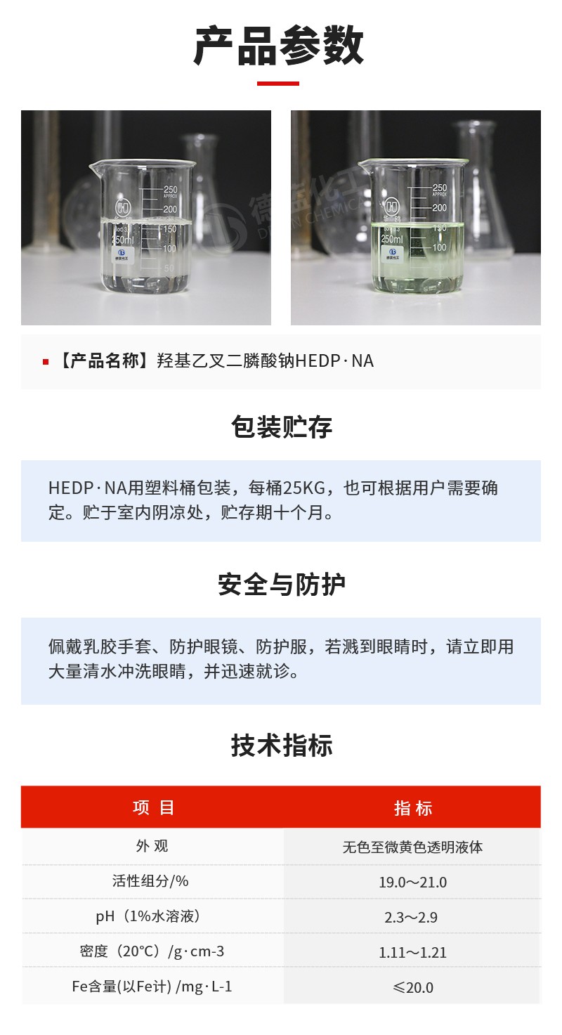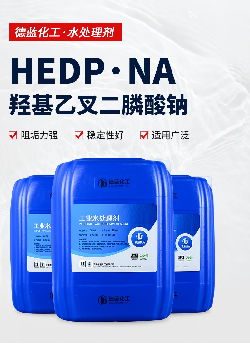 HEDP·Na是一种有机膦酸类阻垢缓蚀剂,能与铁、铜、锌等多种金属离子形成稳定的络合物,能溶解金属表面的氧化物。在250℃下仍能起到良好的缓蚀阻垢作用,在高pH下仍很稳定,不易水解,一般光热条件下不易分解。耐酸碱性、耐氯氧化性能较其他有机膦酸(盐)好。可与水中金属离子,尤其是钙离子形成六圆环螯合物,因而具较好的阻垢效果并具明显的溶限效应,当和其他水处理剂复合使用时,表现出理想的协同效应。HEDP· ......