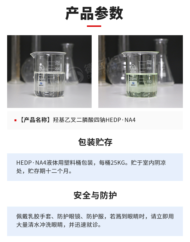 包装储存:HEDP·Na4用塑料桶包装,每桶25kg,也可根据用户需要确定。贮于室内阴凉处,贮存期十二个月。